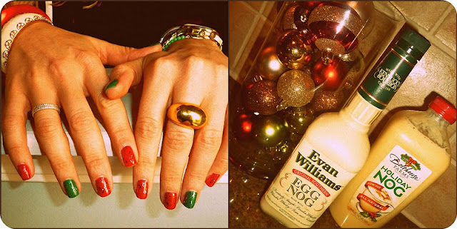 Nothing about Christmas this year has been traditional for me. I am ALWAYS home in NY with my family, surrounded by all of my brothers, grandmothers, uncles, aunts, cousins, parents, niece, and about a half a dozen nephews (and a partridge in a pear tree). There are scores of cookies, homemade sauce for a plethora of Italian pasta dishes, presents, music, old movies, stories of past Christmas debacles (my little brother Josh sneezing in the egg nog), and lots of love. Christmas Eve with my family is my favorite day of the year. It reminds me so much of my Grandpa "Papa" Maglier that it is almost as if he is there with us. This year it's just me, my boyfriend, our puppies, and 60 degree weather. I was pretty bummed this morning. Especially after receiving an adorable voice mail from my brother Joe's family. I must have listened to it 4 times back to back. It was so sweet, but it made me cry (smeared mascara and watery eyes...hence the sunglasses). So, there I was, sad and lonely. My boyfriend had went out to get his haircut, so instead of settling comfortably into my funk of self-pity, I decided to meet him uptown for some breakfast. I threw on this big red vintage cape that I scored at Century Vintage and some leggings. I was cozy and comfortable, and the bright red cape did do a little something for my mood. It made me feel more jolly. Perhaps that is because I favor Mrs. Claus in it. I threw on some lipstick (that was borderline inappropriate for 9am) and had some comfort food (mmm...homefries). Now that I am home, football is on the TV, the white lights from the tree are bouncing off the glitter and bows on the presents surrounding it, our puppies are lounging around and I am sipping some of the delicious (yet ridiculously strong) spiked egg nog pictured above. So while I may not be home for Christmas, I am indeed surrounded by love and feeling very blessed at this moment. Merry Christmas to all (those of you celebrating traditional and non-traditional Christmases this year)! Enjoy every moment and don't forget to count your blessings. I know I won't.